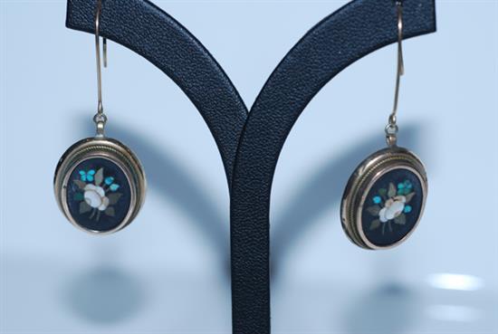 A PAIR OF PIETRA DURA EARRINGS TO SHEPHERD HOOK FITTINGS IN 14CT GOLD.