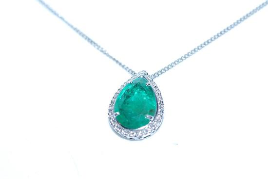 A PEAR CUT EMERALD AND DIAMOND PENDANT WEIGHING 3.35CTS, ALL IN 18CT WHITE GOLD