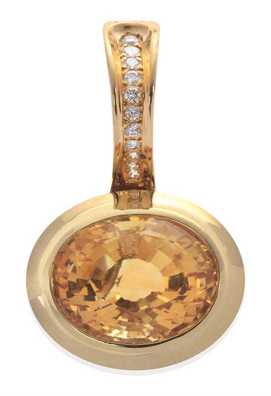 The fancy cut oval citrine in wide bezel setting suspended on a diamond set bale, in 18ct gold, retailed by Makers Mark.