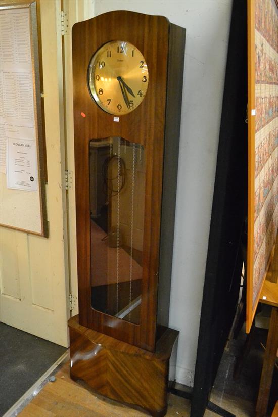 AN ART DECO WALNUT LONG CASE CLOCK (WEIGHTS IN OFFICE)