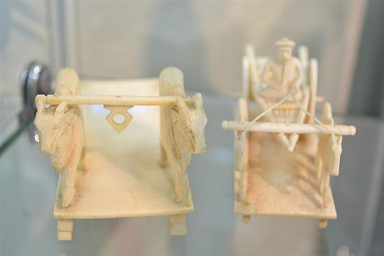 TWO IVORY FIGURES OF MAN ON CART BEING PULLED BY OXENS, ONE A/F