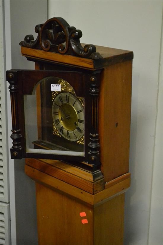 A SMALL LONG CASE CLOCK IN BLONDE WOOD CASE
