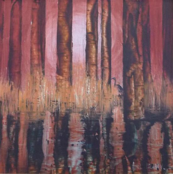 BILL BEAVAN, LIGHT THROUGH THE SWAMP GUMS, OIL ON BOARD, 25 X 25CM