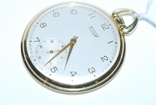 A CROWN WIND OPEN FACED TISSOT POCKETWATCH TO A GOLD PLATED CASE