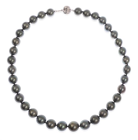 Comprising thirty five round pearls of grey green hues, measuring 11.1mm to 14.1mm, to a ball clasp in 14ct white gold, total length 460mm.