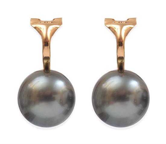 Each earring comprising a round pearl of grey hues, measuring 11.0mm, to clip fittings in 18ct gold.