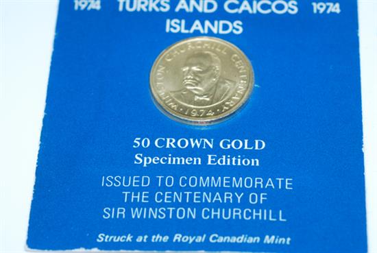THE TURKS AND CAICOS ISLANDS 50 CROWN PROOF COIN IN 12CT GOLD COMMEMORATING THE SIR WINSTON CHURCHILL CENTENARY 1974 IN PLASTIC SLEEVE (8)