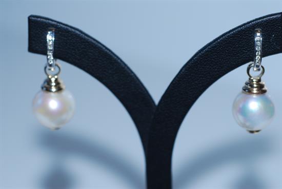A PAIR OF SOUTH SEA PEAL AND DIAMOND EARRINGS ON DETACHABLE HOOP FITTINGS, IN TWO TONE 9CT GOLD.