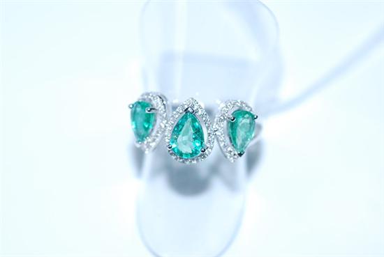A TRIPLE CLUSTER EMERALD AND DIAMOND RING SET WITH PEAR CUT EMERALDS TOTALLING 1.17CTS, IN 18CT WHITE GOLD, INDEPENDENT VALUATION AVAILABLE