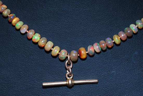 A GRADUATED OPAL NECKLACE WITH T-BAR FITTING AND SWIVEL CLASP IN 9CT GOLD