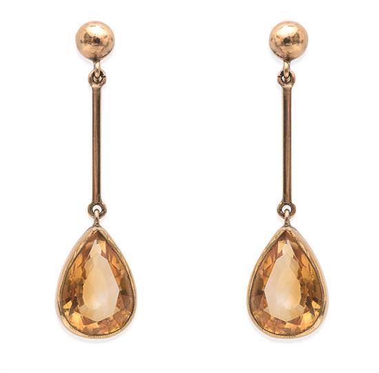 Of Edwardian style, each earring comprising a pear cut citrine, suspended on a long baton, to screwback fittings, in 9ct gold.