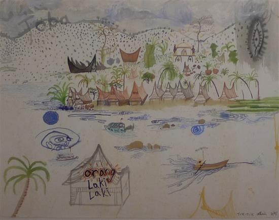 PRO HART, FIGURE BY THE LAKE, OIL ON PAPER, 19.5 X 49CM