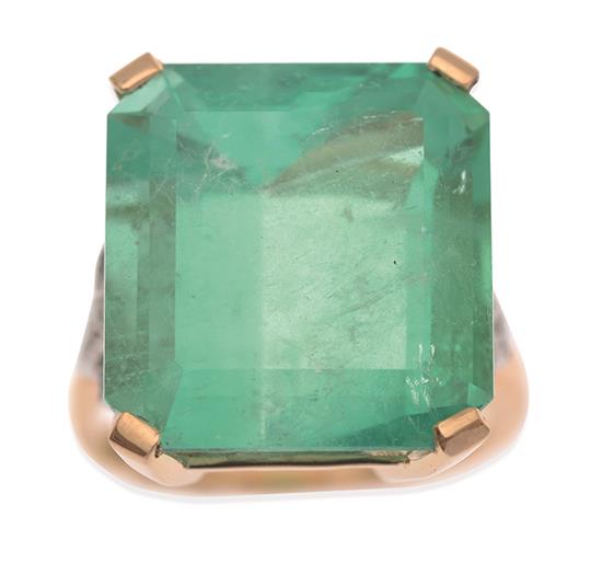 Centrally set with an emerald cut emerald weighing 18.10cts, within geometric emerald and diamond set shoulders, in millegrain decoration, in 18ct gold, independent valuation available, ring size N-O.