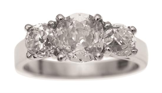 Centrally set with an old style vintage cut diamond weighing 1.17cts, flanked by a diamond to each side, together totalling 1.31cts, in 18ct white gold, independent valuation available, ring size L-M.