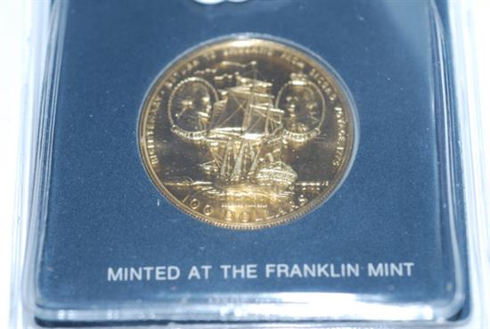 A COOK ISLANDS ONE HUNDRED DOLLAR COIN 1975 IN 21CT GOLD FROM THE FRANKLIN MINT WITH PAPERS WITH PAPERS (55)