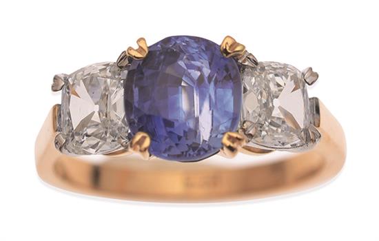 Centrally set with an oval sapphire weighing 2.56cts, flanked by an old style vintage cut diamond to either side, together totalling 1.0ct, in 18ct gold, independent valuation available, ring size N-O.