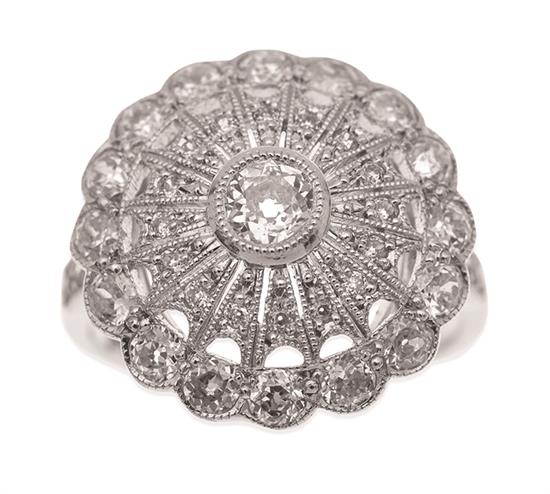 The pierced circular plaque centred with an old style vintage cut diamond weighing 0.34cts, within a diamond set surround in millegrain decoration, in 18ct white gold, independent valuation available, ring size O-P.