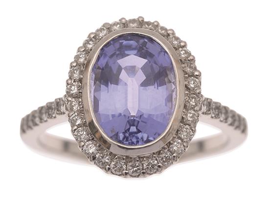 Of oval cluster design, centrally set with an oval sapphire weighing 4.04cts, within a border of round brilliant cut diamonds, and diamond set shoulders, in 18ct white gold, independent valuation available, ring size M-N.