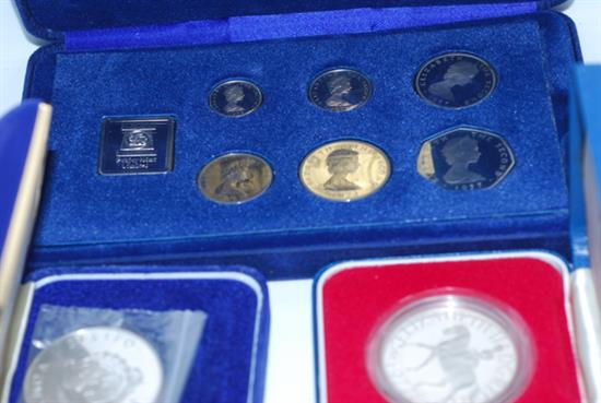 A JUBILEE COIN DATED 1977 IN STERLING SILVER BOXED WITH PAPERS TOGETHER WITH AN ISLE OF MAN PROOF SET OF SIX COINS BOXED, AND TWO CROWNS INCLUDING WINSTON CHURCHILL CENTENARY DATED 1974, WESTERN SAMOA STERLING SILVER COIN BOXED AND A PROOF SET OF SINGAPORE COINS(63 - 68)