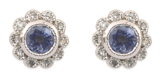Of floral cluster design, each earring centrally set with a sapphire, within a a scalloped border of round brilliant cut diamonds, to post and butterfly fittings, in 18ct white gold, independent valuation available.