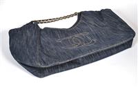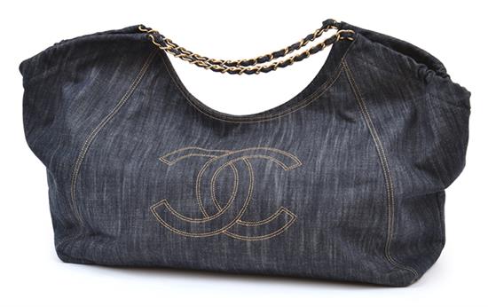 Styled in blue denim with contrast stitching and woven gold metal handles, 11347446, 43 x 29 x 19cm, authenticity card included.
