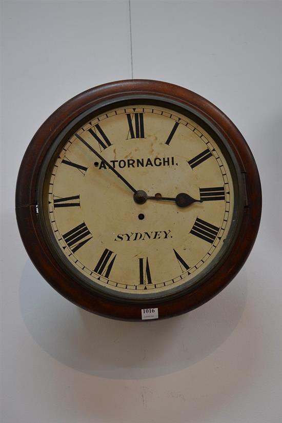 A. TORNACHI, SYDNEY, SINGLE FUSEE CEDAR CASED RAILWAY CLOCK, PENDULUM (GLASS FACE LOOSE)