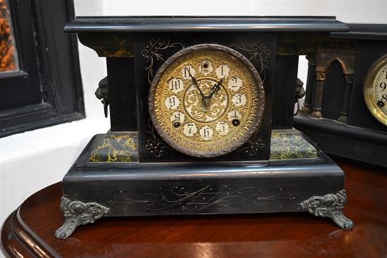 EARLY 20TH CENTURY SESSIONS FOUR FOOTED ADAMANTINE MANTEL CLOCK WITH RETICULATED GILT METAL FACE AND LIONS HEAD HANDLES (PENDULUM, NO KEY)