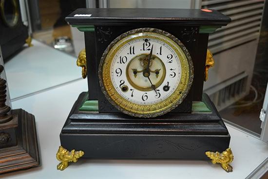 19TH CENTURY ANSONIA FOUR FOOTED SLATE CASED AND GILT METAL MOUNTED CLOCK WITH LIONS HEAD HANDLES (PENDULUM, KEY)