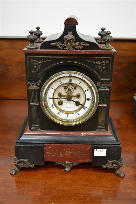 19TH CENTURY DENIS BROS & CO., MELBOURNE FOUR FOOTED ROUGE MARBLE AND SLATE BRACKET CLOCK (TOP MARBLE SLAB LOOSE, PENDULUM , NO KEY)