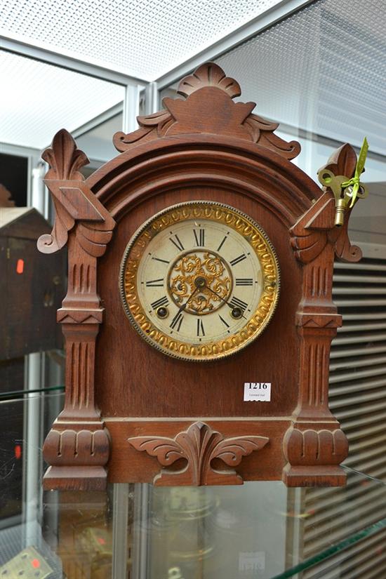ANSONIA WOOD CASED MANTEL CLOCK WITH ORNATE GILT METAL DIAL (KEY, PENDULUM)