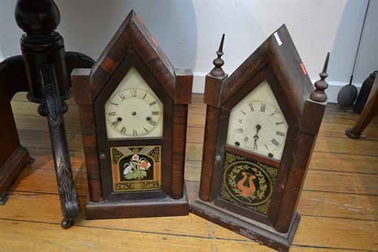TWO JEROME & CO. STEEPLE CLOCKS WITH PAINTED GLASS FACES (BOTH ALL FAULTS)