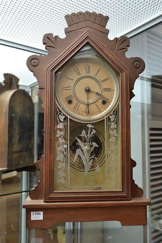 SMALL ANSONIA COTTAGE CLOCK WITH FLORAL DESIGN TO GLASS FACE (PENDULUM, KEY)