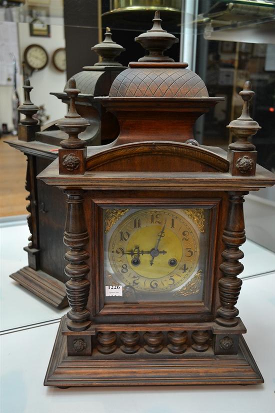 ELABORATE CONTINENTAL OAK CASED MANTEL CLOCK WITH GILT METAL DIAL (PENDULUM, KEY)