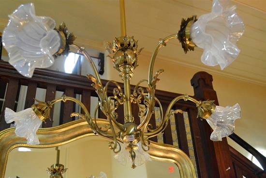 PAIR OF BRASS FIVE BRANCH CHANDELIERS WITH VASELINE SHADES