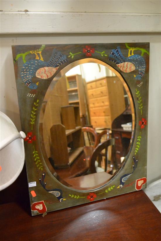 WOOD FRAMED MIRROR WITH HAND PAINTED EXOTIC BIRD FOLK ART DESIGN
