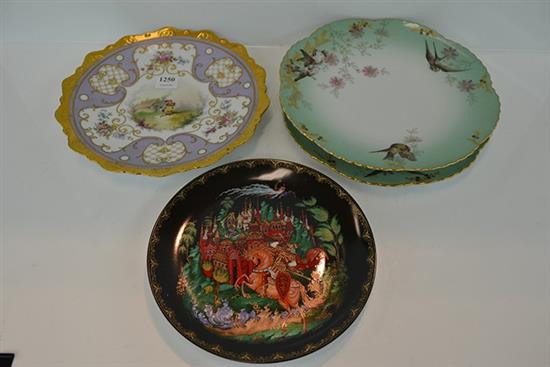 GROUP OF FIVE DECORATIVE PLATES INCLUDING HEAVILY GILDED, BIRD DECORATED ETC