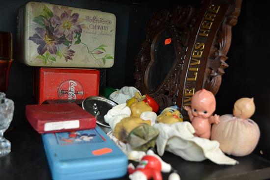 PART SHELF OF COLLECTIBLES INCLUDING COCA COLA MEMORABILIA, PUPPETS, CUPIE DOLL ETC