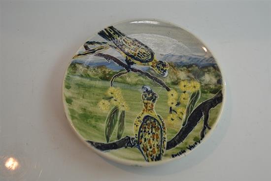 A. M. BOYD PLATE WITH KOOKABURRA DESIGN, SIGNED ANGELA VASEY (FAULTS)