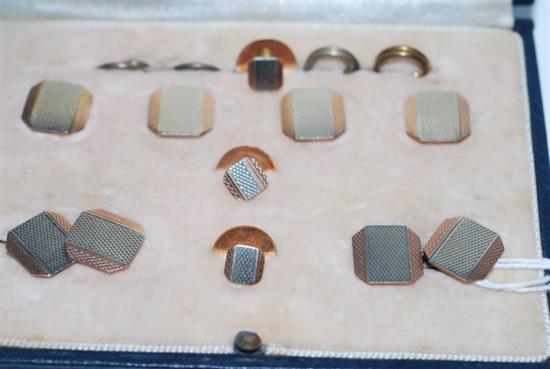 AN ART-DECO CUFFLINK, BUTTON AND DRESS STUD SET IN 9CT GOLD AND SILVER.