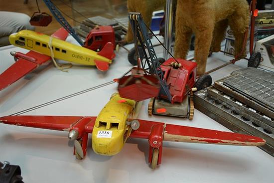 A VINTAGE WOODEN FRENCH TOY PLANE AND A GAMA TOY CRANE