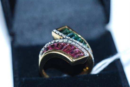 Of modern crossover design, set with pink and green tapering baguette cut tourmalines, with fine diamond detail, in 18ct gold, ring size N-O.
