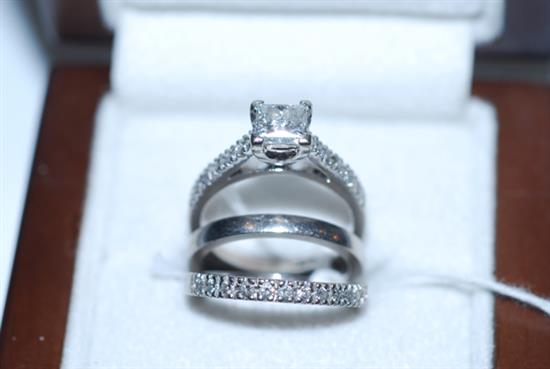 A SOLITAIRE DIAMOND RING CENTRALLY SET WITH A PRINCESS CUT DIAMOND WEIGHING APPROXIMATELY 1.00CT, TOGETHER WITH TWO FITTED DIAMOND SET BANDS, ALL IN 18CT WHITE GOLD