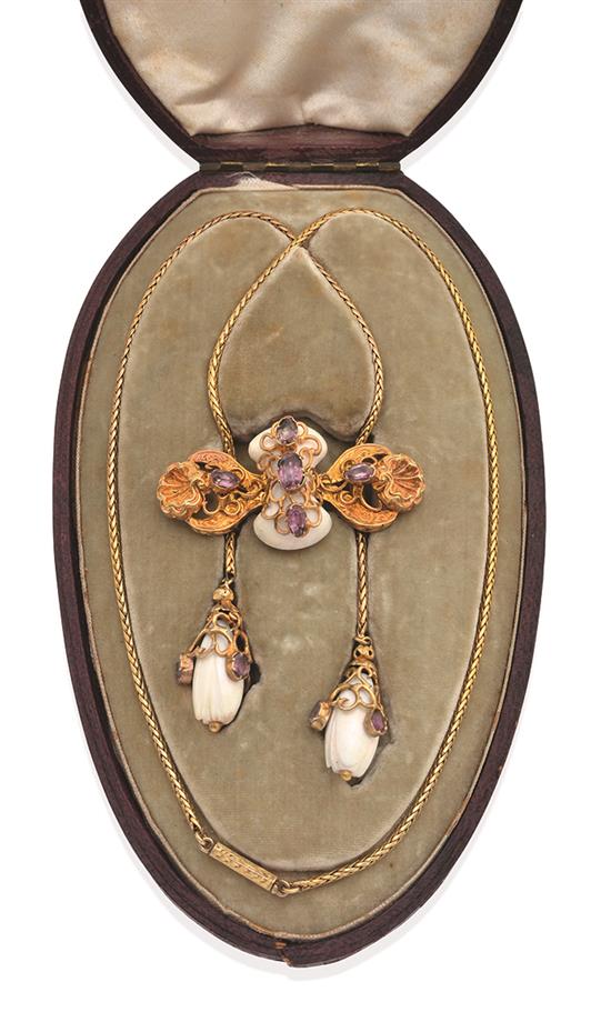 Comprising a central scrolled panel set with opalescent glass embellished with applied gold and pink topaz, suspending two conforming teardrop shaped pendants, on an integral fancy link chain, in 15ct gold, in original fitted box.