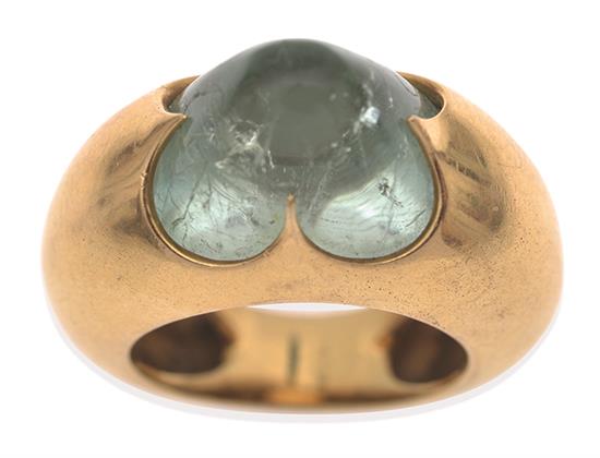 Of modern design, the conical shaped emerald cut en cabochon, within a scalloped surround and wide domed band, in 18ct gold, French hallmarks, ring size L-M.