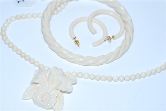A SUITE OF IVORY JEWELLERY INCLUDING FLORAL NECKLACE , BANGLE AND EARRINGS