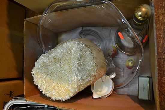 ONE BOX INCLUDING TINS, FRUIT SHAPED CRUETS, VINTAGE HAT ETC