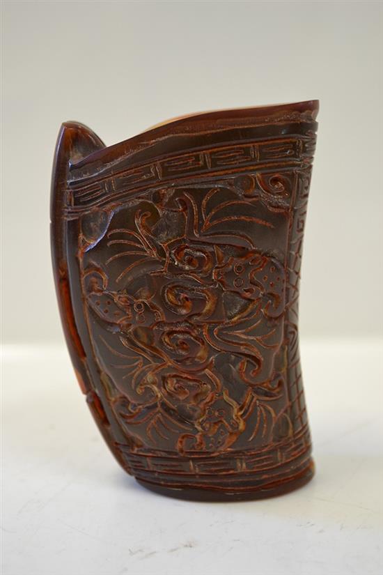 CHINESE HORN BOWL WITH CARVED BAT DECORATION