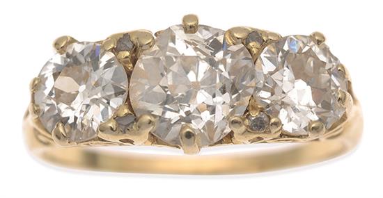 Of half hoop design, centrally set with an old European cut diamond weighing 1.12cts, flanked by a diamond to either side, together totalling 1.0ct, with fine rose cut diamond detail, in 18ct gold, independent valuation available, ring size K-L.