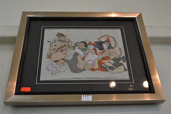 HAND PAINTED EROTIC PICTURE OF 7 LUCKY MASTERS ON SILK, FRAMED