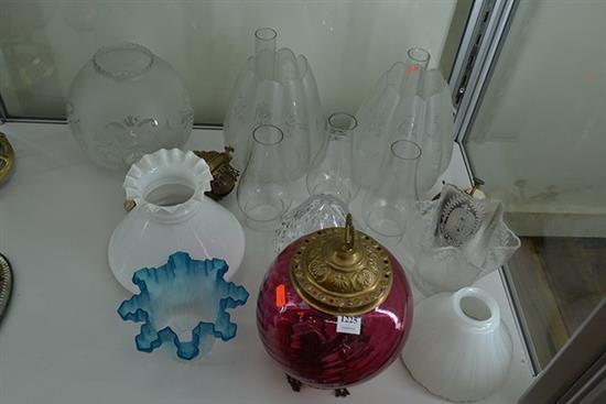 COLLECTION OF KEROSENE SHADES AND CHIMNEYS INCLUDING RUBY GLASS, ETCHED GLASS ETC